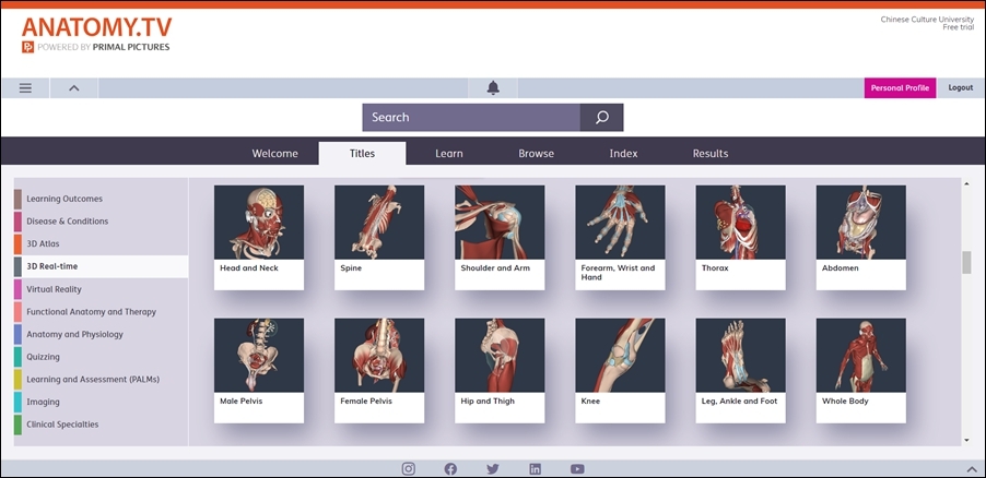 為英國 Informa UK Limited出版社所出版,內容包含3D ATLAS、3D Real Time、Functional Anatomy and Therapy、Anatomy & Physiology、Imaging、Clinical Specialties、Quizzes 等模組。分別提供基礎生理學、解剖圖譜影像及詳細解剖部位說明、超音波、MRI、CT醫學影像判讀導引,以實際臨床操作影片、動畫及圖片解說肌肉運動機制,並包涵聽語(語言)治療、物理治療、運動醫學、針灸等專科主題。Primal Picture解剖資料庫以多元之素材提供專業的基礎及臨床醫學資訊,方便老師、同學進行人體各部位之學習及預習準備。