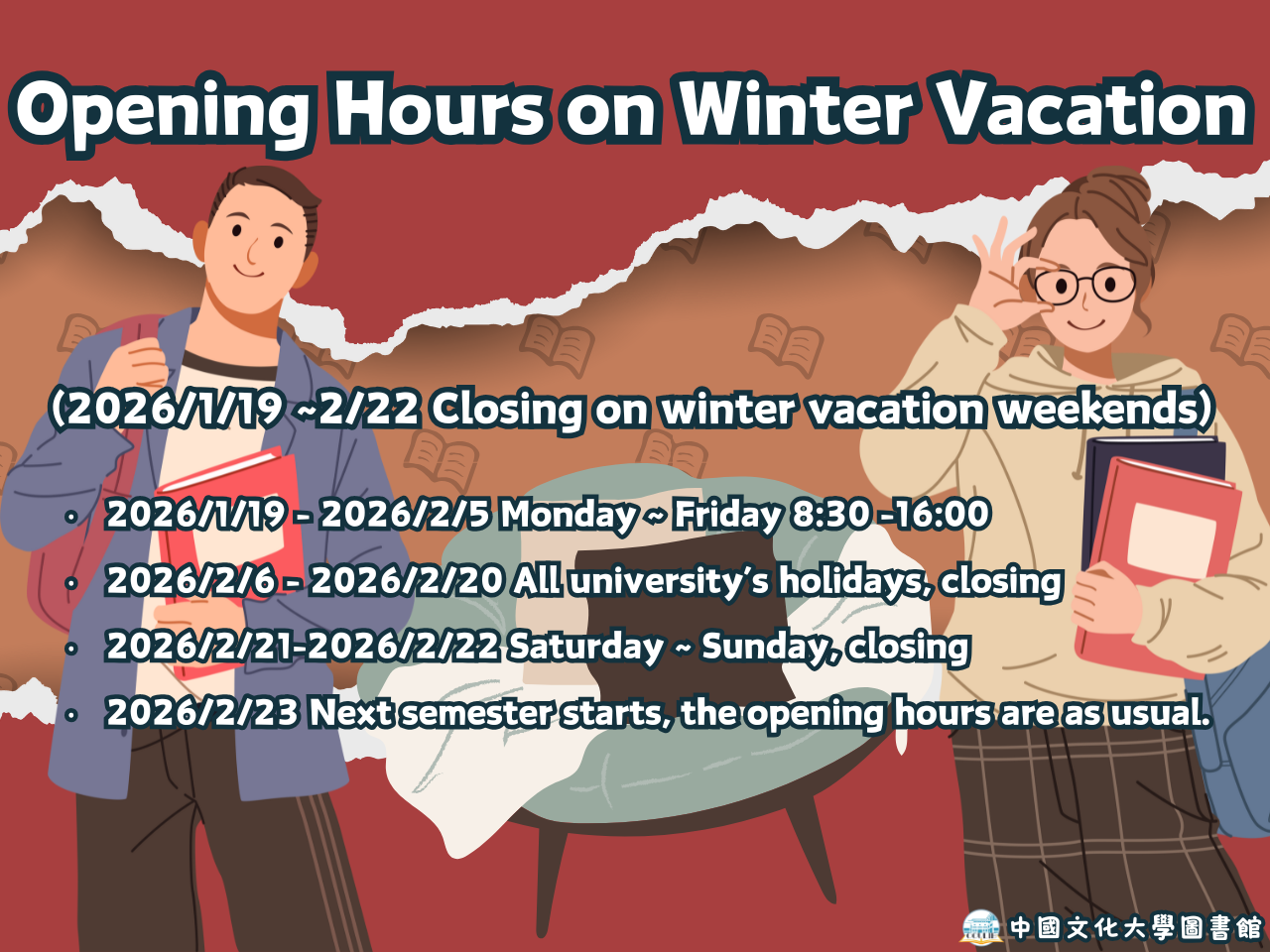 [圖書館] 115年寒假休館公告(Library Opening Hours on Winter Vacation)